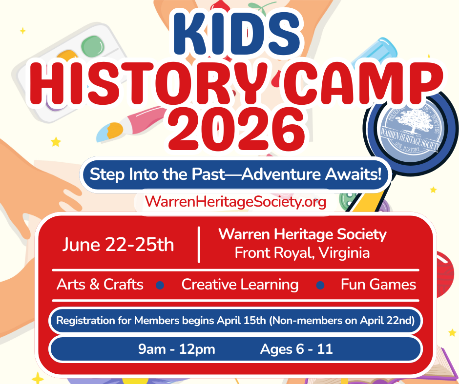 History Camp is staffed by Warren Heritage Society employees and volunteers who will look to your child’s safety and needs as well as see that everyone has a fun time. Students will be provided a ready supply of drinking water, healthy snack food, and rest breaks throughout the camp day. Campers should wear clothes comfortable for being active in summer weather. Although many activities will be outside, campers will come indoors for breaks and activities over the course of the day. Campers should be dropped off and picked up on time, as some activities may involve traveling via transportation or walking to other sites in the Town and County.